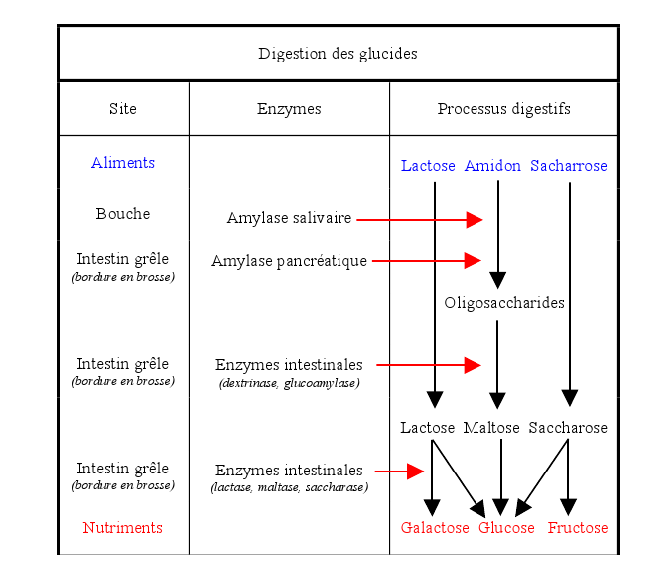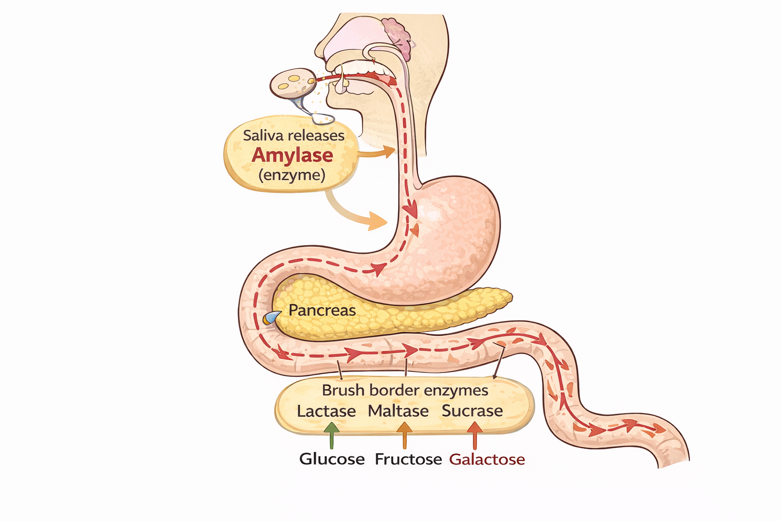 In the small intestine, pancreatic amylase continues starch hydrolysis, producing disaccharides and oligosaccharides. These are further cleaved by brush border enzymes—lactase, maltase, and sucrase—into absorbable monosaccharides: glucose, fructose, and galactose.[10]